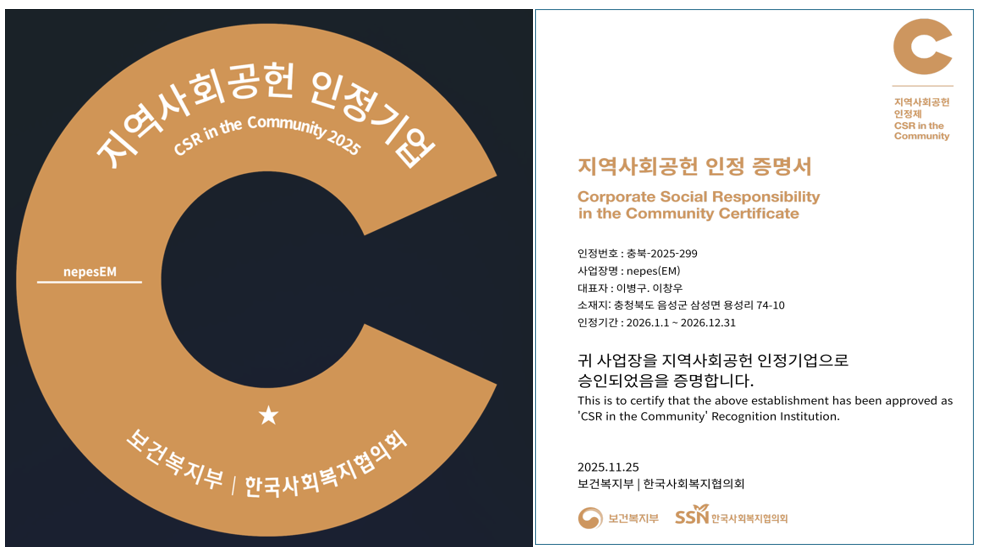 네패스 EM사업부는 보건복지부와 한국사회복지협의회가 주관하는 ‘2025 지역사회공헌 인정제’ 신규 인정기업으로 선정되어 지난 11월 25일 인증패를 공식 수여받았다.